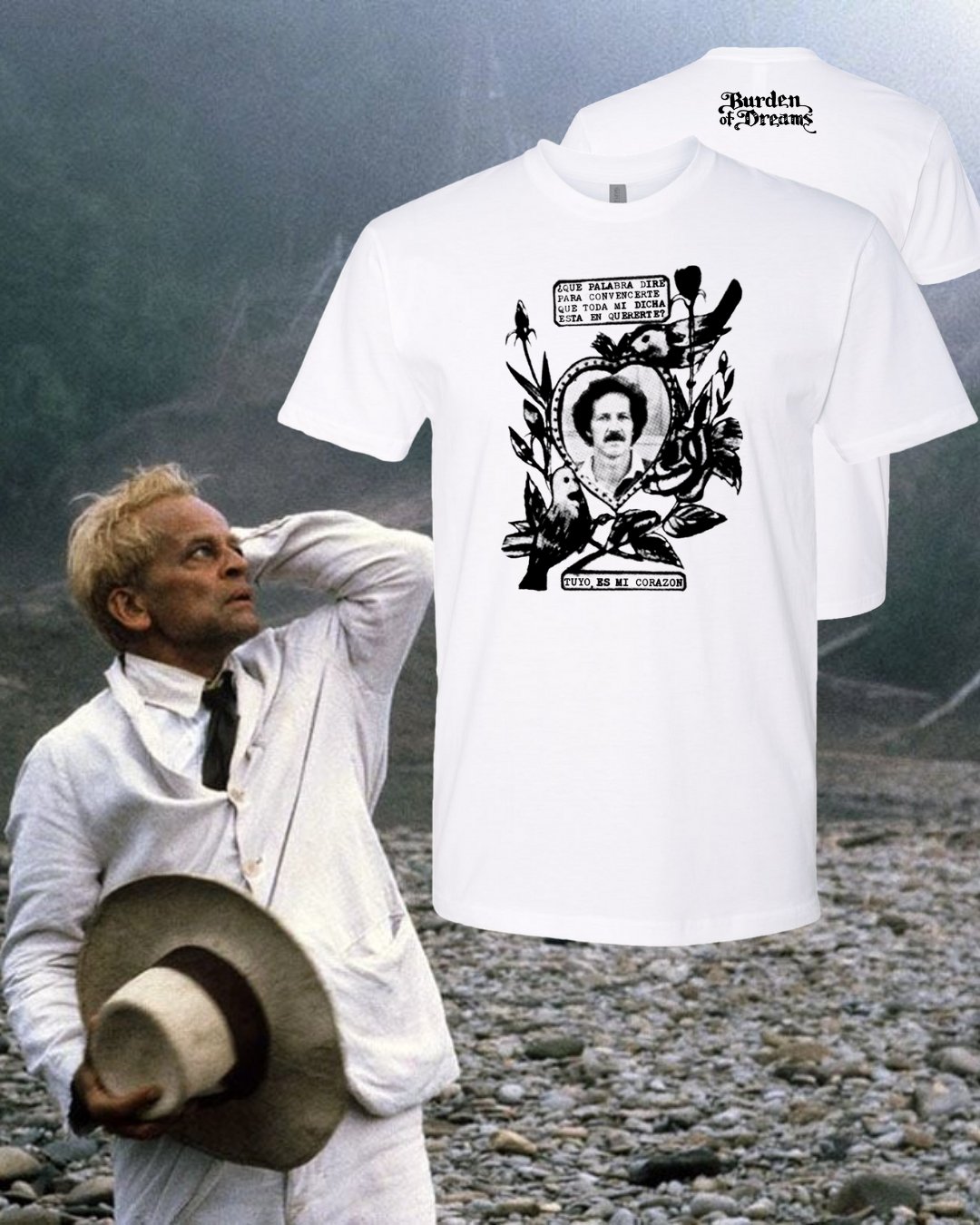 The other day, I showed my partner the movie Burden of Dreams, which is stealthily one of the great t-shirt movies of all time. At the end of the film, a photographer takes a photo of Werner Herzog, which is gussied up thusly, and both of us went "I'd wear that on a t-shirt," and thus it is. You need this shirt like they need the opera in Iquitos.