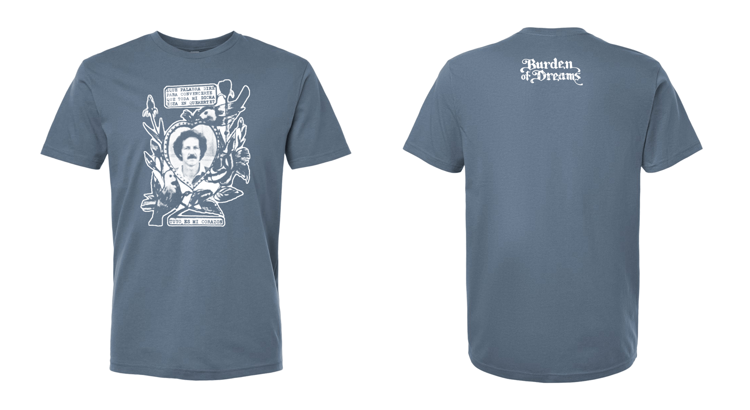 The shirt is available two ways: printed in black ink on white Next Level blanks, and printed in white ink on "blue jean" Next Level blanks. PLEASE BE SURE YOU HAVE SELECTED THE VERSION YOU WANT BEFORE ORDERING. The front design is the memento mori image of Herzog, the back says "Burden of Dreams." As always, these will be printed by the incomparable crew at the LVAC, who were invaluable in cleaning up the artwork, which was initially done up for printing by my partner, Emmett, who is really gonna have his mind blown when we sit down to watch Fitzcaraldo together.